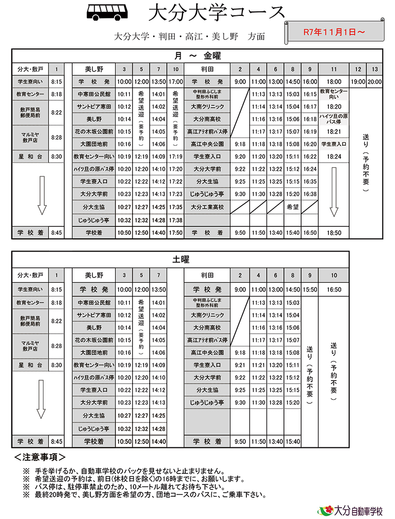大分大学・判田・高江・美し野方面をまわる大分大学コースのスクールバス