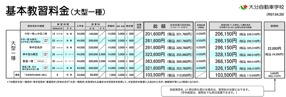 こちらの料金は、教習を修了し卒業して運転免許を申請するために必要な料金の総額です。