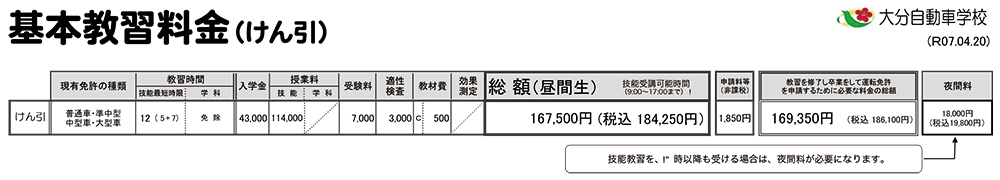こちらの料金は、教習を修了し卒業して運転免許を申請するために必要な料金の総額です。
